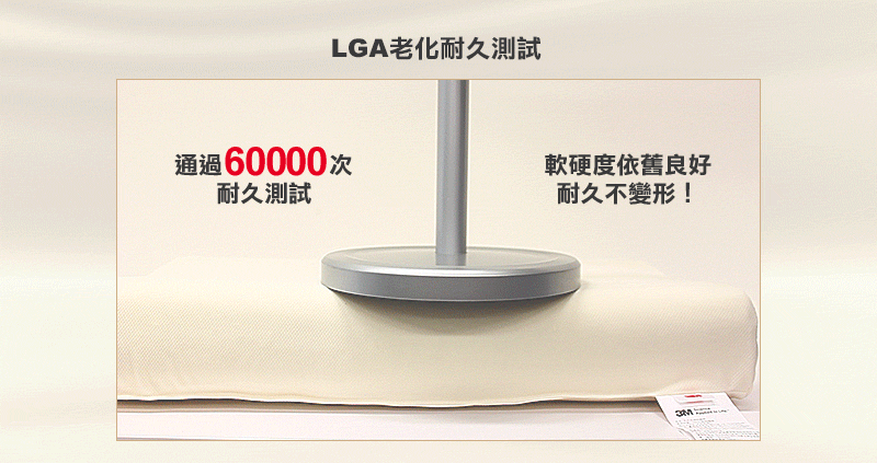 高支撐性:LGA60000次老化耐久測試 LGM永久壓縮測試,產品耐用有保障。
