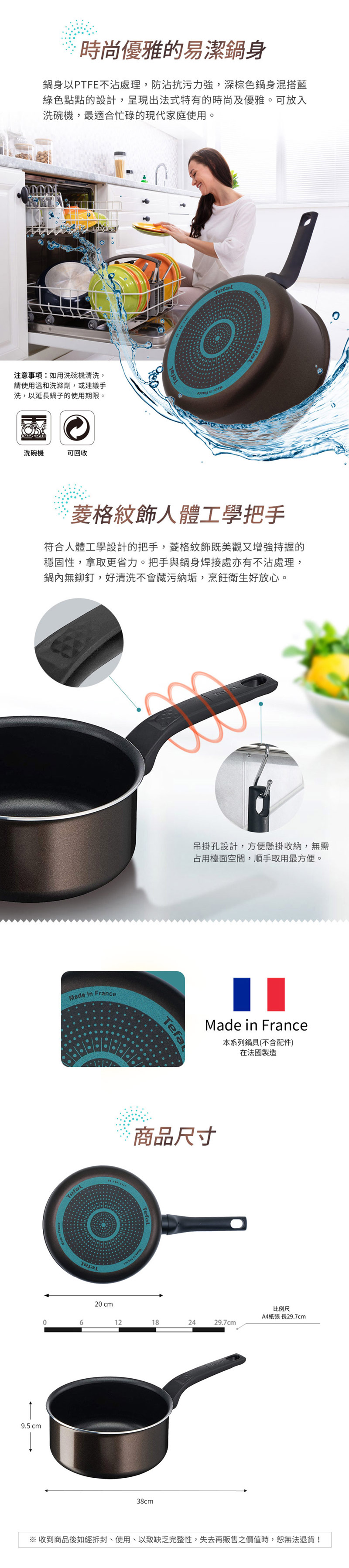 鍋身以PTFE不沾處理,防沾抗污力強,深棕色鍋身混搭藍綠色點點的設計,呈現出法式特有的時尚及優雅。可放入洗碗機,最適合忙碌的現代家庭使用。