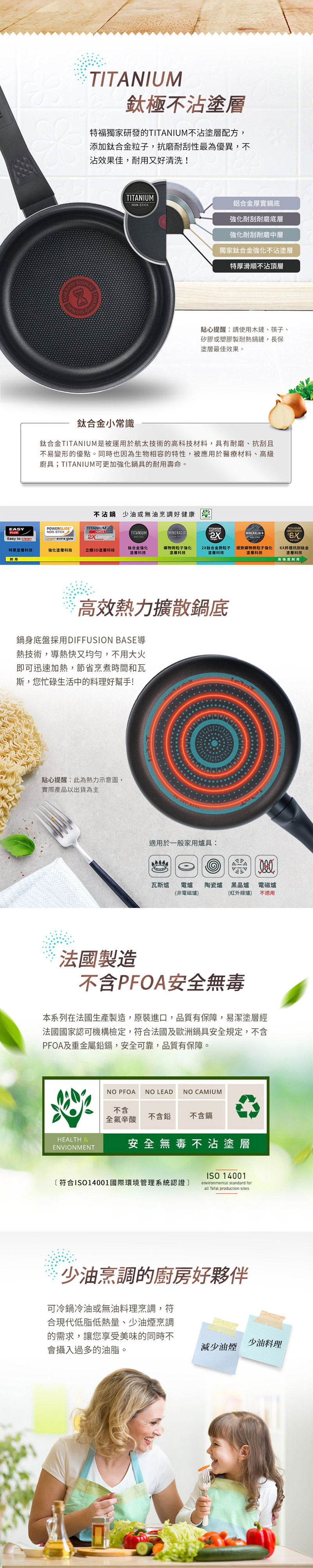 特福獨家研發的TITANIUM不沾塗層配方,添加鈦合金粒子,抗磨耐刮性最為優異,不沾效果佳又好清洗!