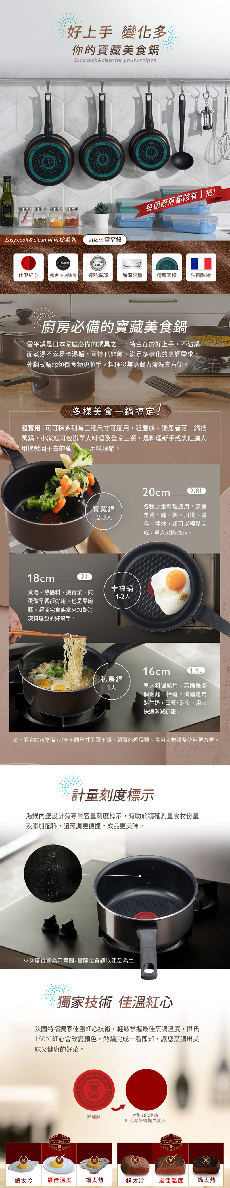 專利智慧感溫佳溫紅心顯示,輕鬆掌握最佳烹調溫度,攝氏180度時紅心會改變顏色,熱鍋完成一看即知,讓您烹調出美味又健康的好菜。