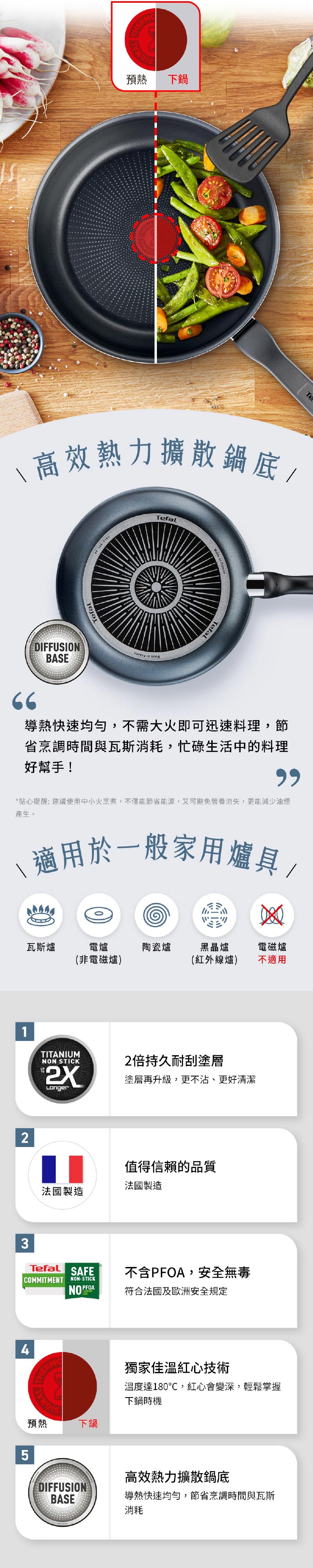 4.特福不沾鍋因鍋底設計具有高傳熱功能,建議用中小火烹調即可,節省能源又可避免營養流失,更能減少油煙的產生。