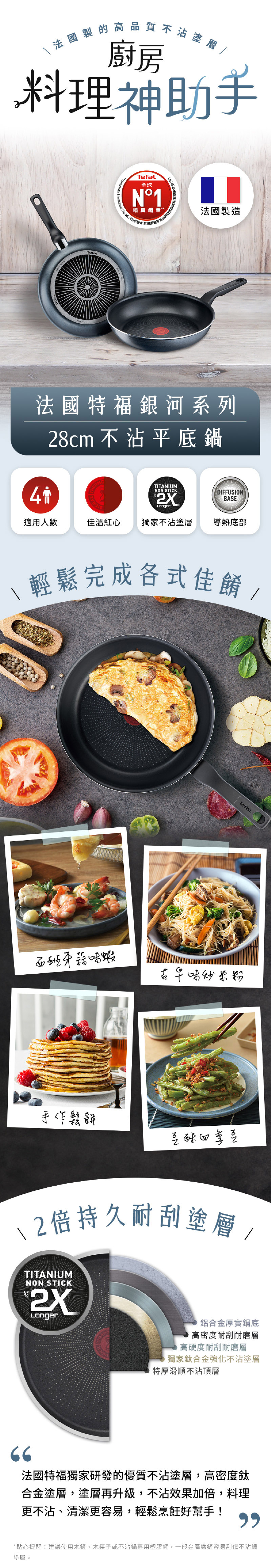 獨家研發的TITANIUM 2X 不沾塗層配方,添加鈦合金微粒子,極強效抗磨耐刮,不沾效果佳又好清洗!