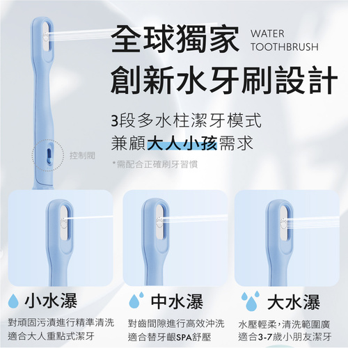 ◆獨家創新水牙刷噴頭,3段水柱潔牙模式,兼顧大人小孩需求。