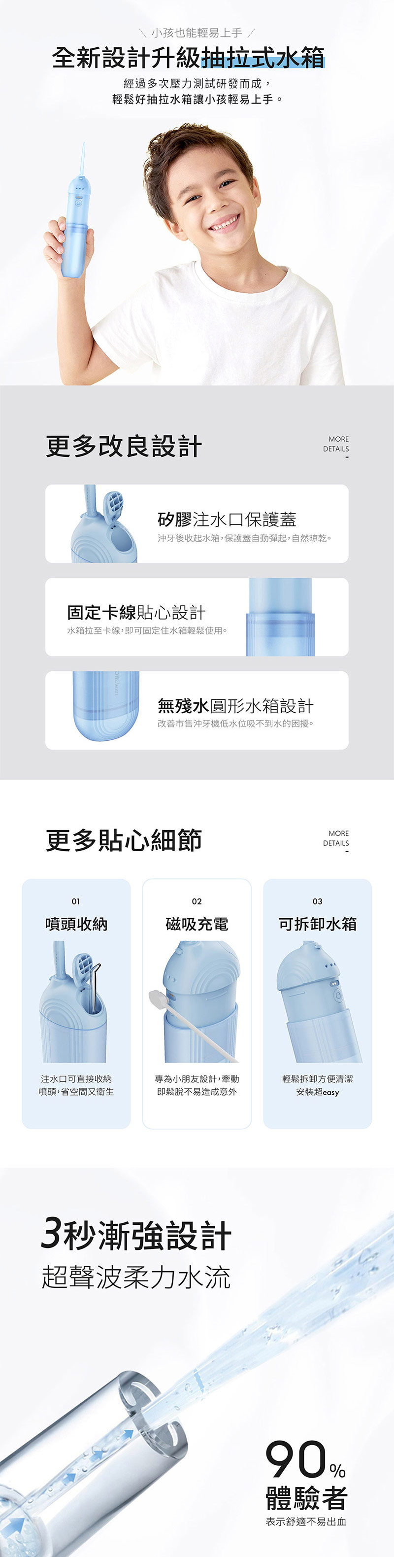 ◆獨家創新水牙刷噴頭,3段水柱潔牙模式,兼顧大人小孩需求。