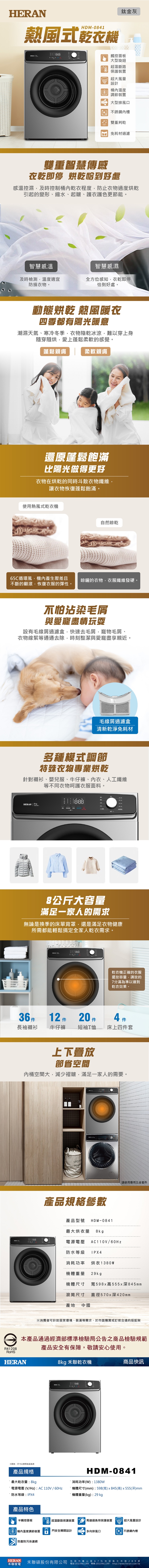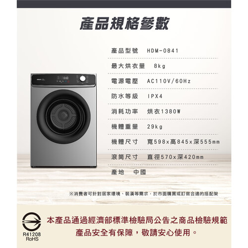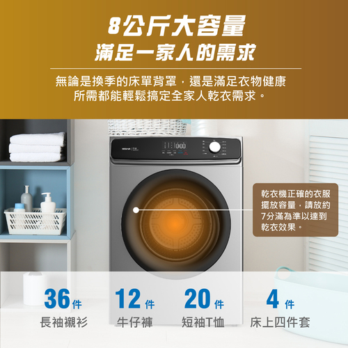 禾聯8kg 熱風式乾(烘)衣機HDM-0841