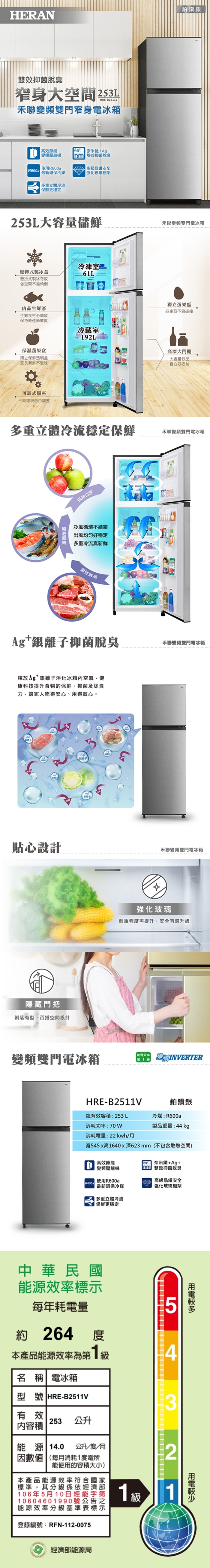 禾聯253L 變頻1級能效雙門窄身電冰箱HRE-B2511V