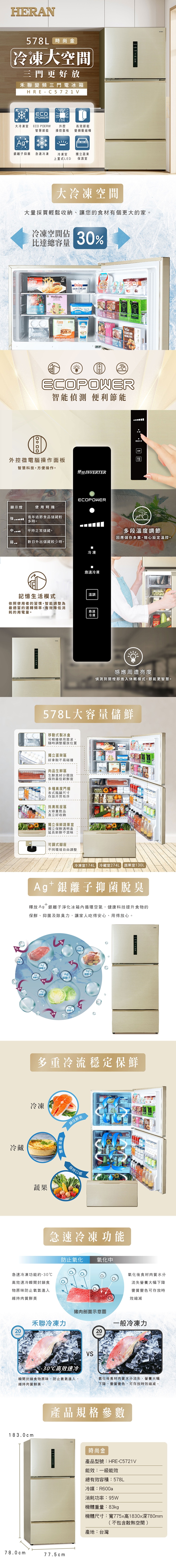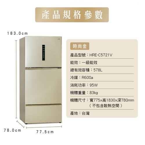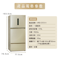 禾聯 578L變頻1級能效大三門電冰箱HRE-C5721V