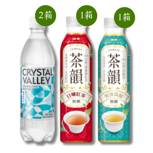【台灣好茶飲組】礦沛原味氣泡水585ml(24瓶)*2+茶韻雲沐烏龍580ml(24瓶)*1+茶韻日曦紅茶580ml(24瓶)*1