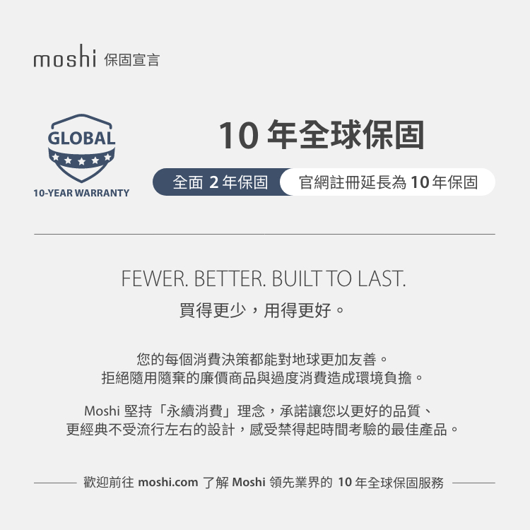 * Moshi 產品皆享有 2 年全球保固服務,前往 moshi.com/register 完成註冊可延長為 10 年