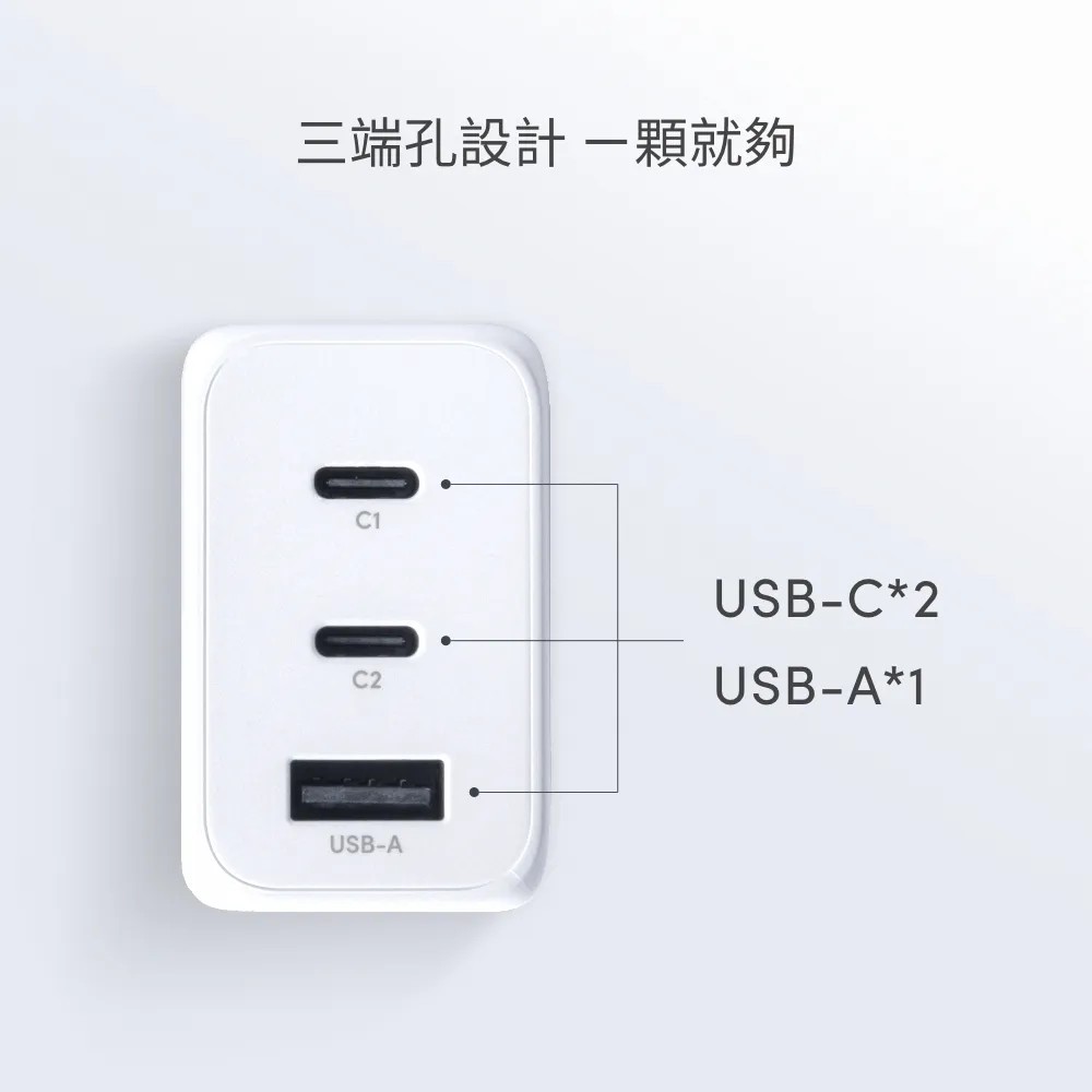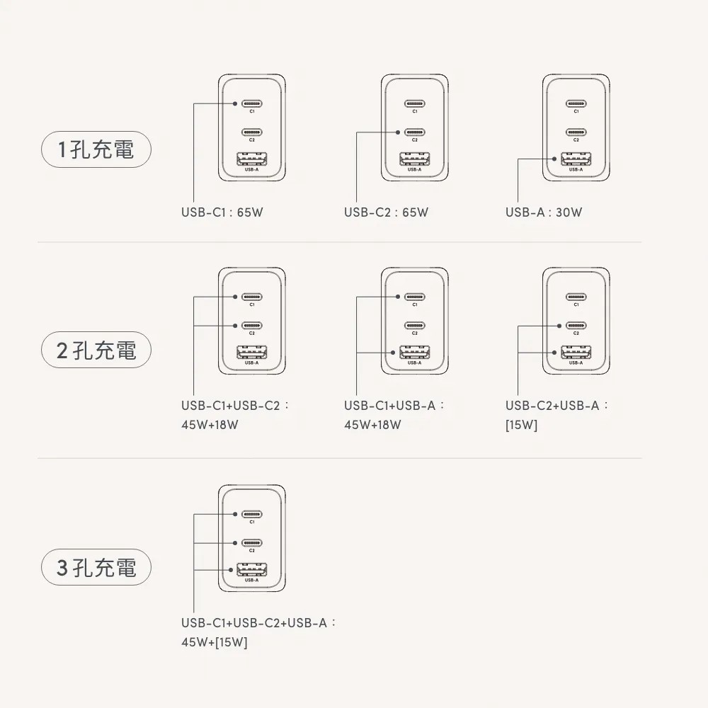 - ■ USB-C 端口支援 PD 3.0 與QC 4+ 快充,功率最高可達65 W