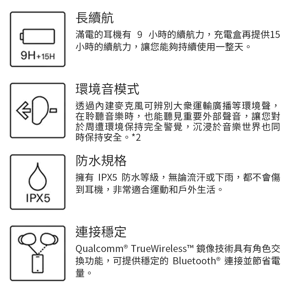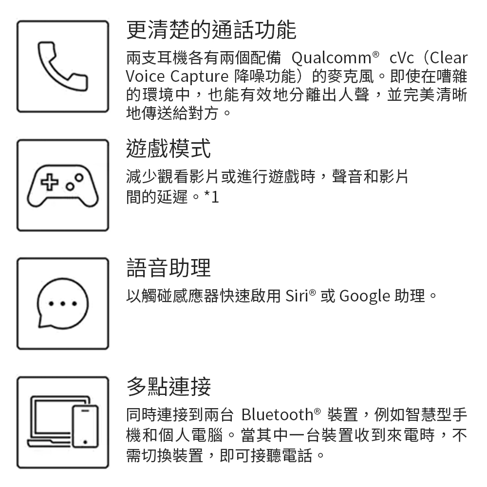 - 單耳或雙耳都可得到清晰無比的通話,進階麥克風和 Qualcomm cVc(Clear Voice Capture 降噪功能)