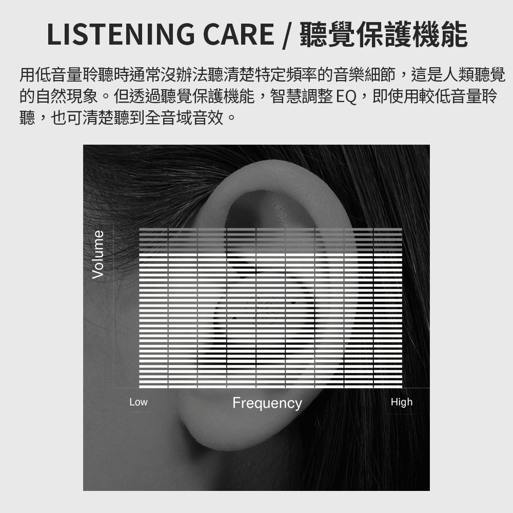 - 透過耳機控制器的應用程式提供 5 種 EQ 預設模式 聽覺保護機能,透過智能化調整EQ,讓您用低音量也能清楚聽到全頻段音效。