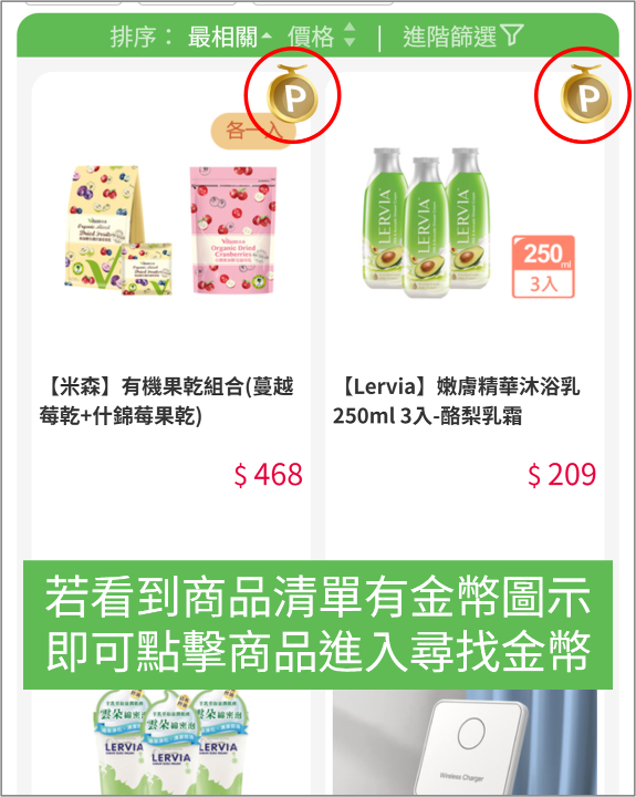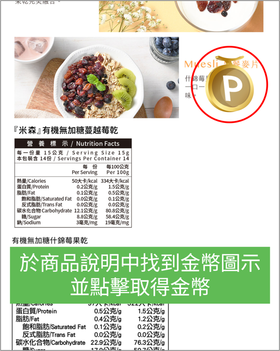 • 活動期間內每週(以週一 00:00 起至週日 23:59 止計算)瀏覽全站商品,並於商品說明頁面尋找「金幣」icon(需先登入會員帳戶),點擊以獲取「金幣」(如下圖所示)。