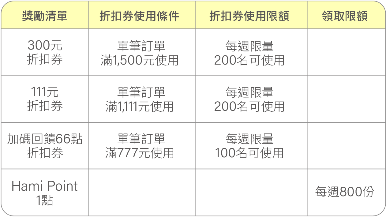 • 點數再生術:單筆訂單回饋使用Hami Point抵扣金額之3% Hami Point,每帳戶回饋上限3,000點,活動總回饋上限30,000點,依結帳成功順序認定,額滿為止。
