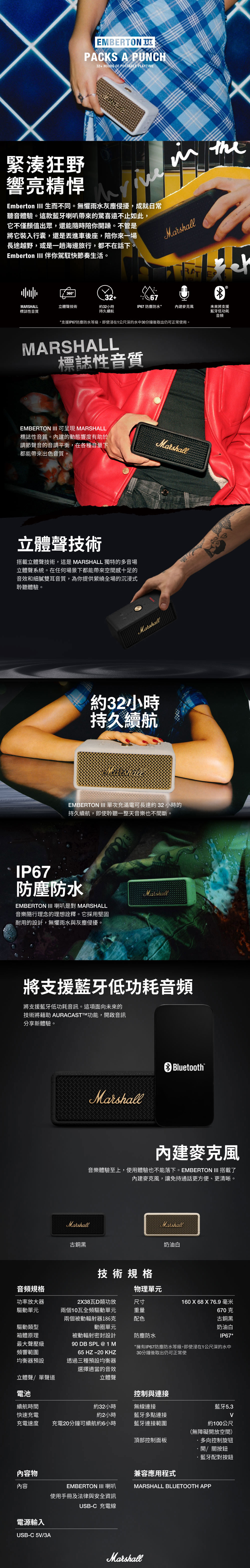 【Play All Day】Marshall Emberton III 三代藍牙喇叭(黑) + 鐵三角藍牙耳機(ATHCKS30TW+) + IOIO行動電源