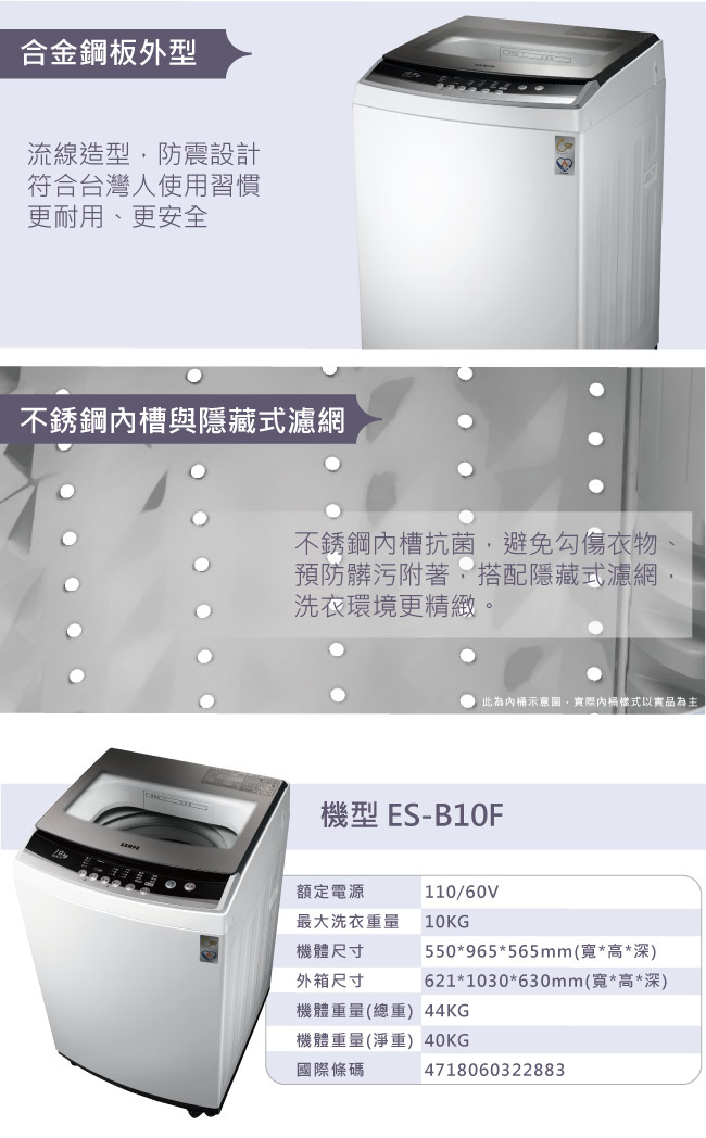 聲寶10公斤單槽直立式定頻洗衣機ES-B10F