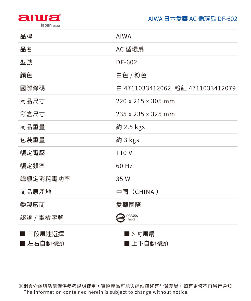 AIWA 愛華 AC循環扇 DF-602 白