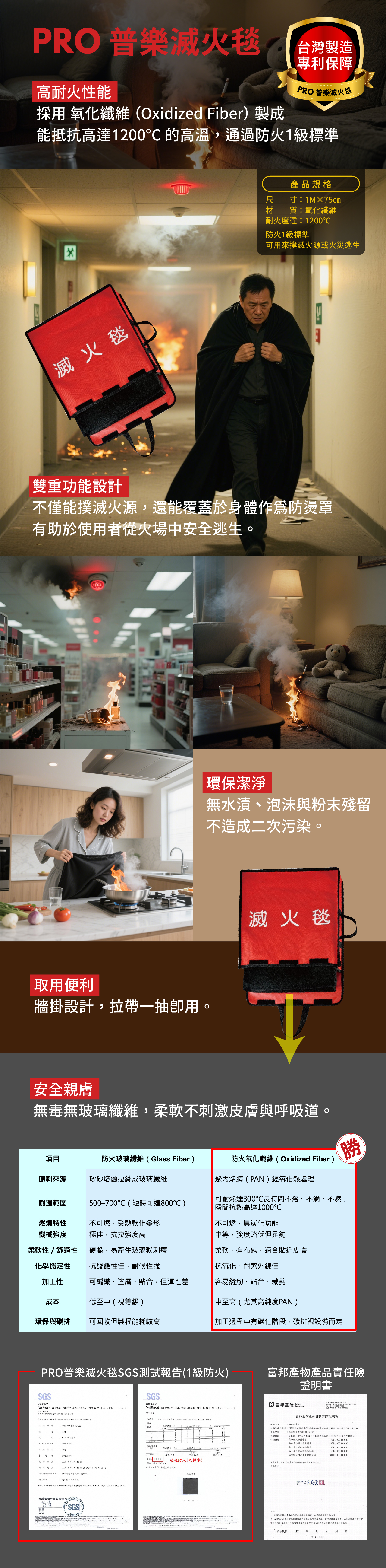 - 雙重用途:可滅火,亦可覆身防燙,助安全逃生。