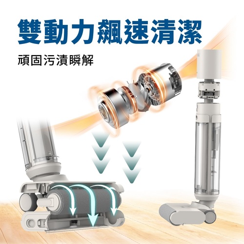 雙動力馬達驅動滾刷高速旋轉,搭配強勁吸力,乾濕垃圾同步清除,醬油、咖啡漬、寵物腳印都能輕鬆瓦解。
