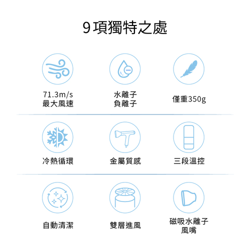 我們都知道早上起床面對亂翹翹的頭髮有多困擾。這款革命性的產品能讓你在短短幾分鐘內擁有沙龍般美麗的髮型,因為擁有71.3m/s超高風速,搭配水離子風嘴,能夠在低溫狀態下,快速定型您的秀髮。