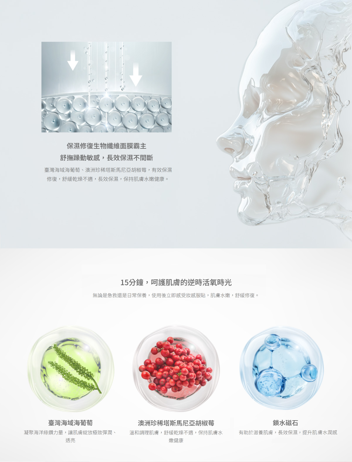- 臺灣海域海葡萄、澳洲珍稀塔斯馬尼亞胡椒莓,有效保濕修復,溫和調理肌膚,舒緩乾燥不適,搭配鎖水磁石&白樺蜜糖,長效保濕72小時,保持肌膚水嫩健康。