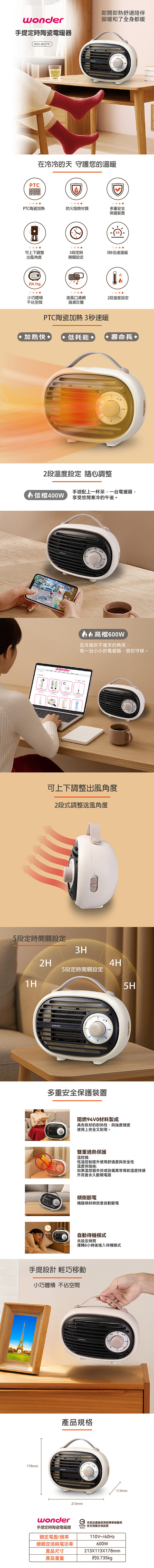 WONDER 手提定時陶瓷電暖器 WH-W27F