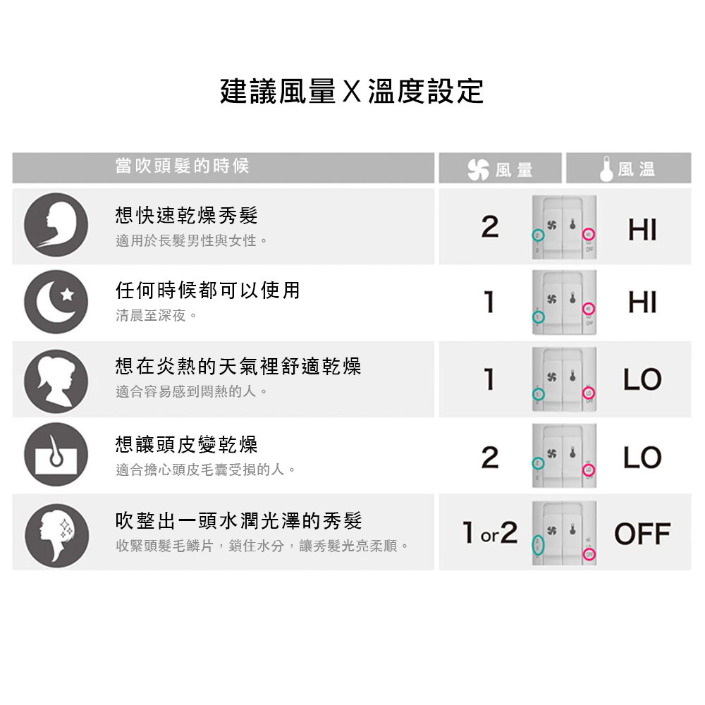 ●3段風溫x2段風速量調節:可以根據季節、頭髮和皮膚狀況進行調節
