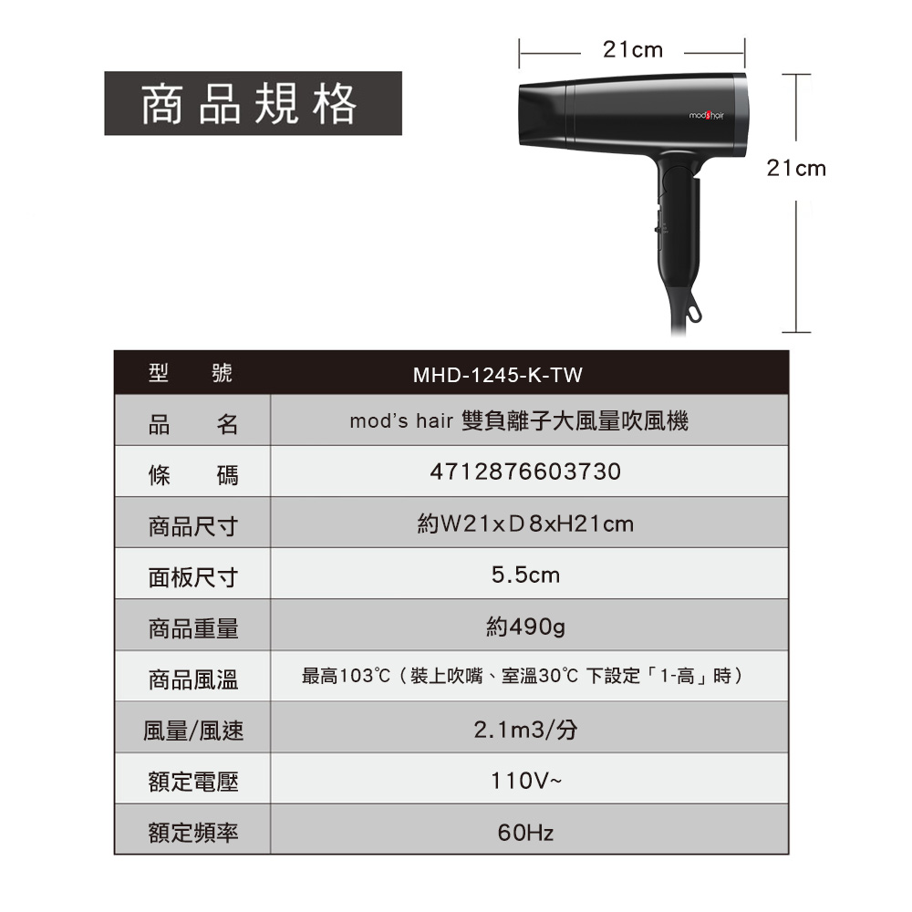 mod's hair雙負離子大風量吹風機 MHD-1245-K-TW