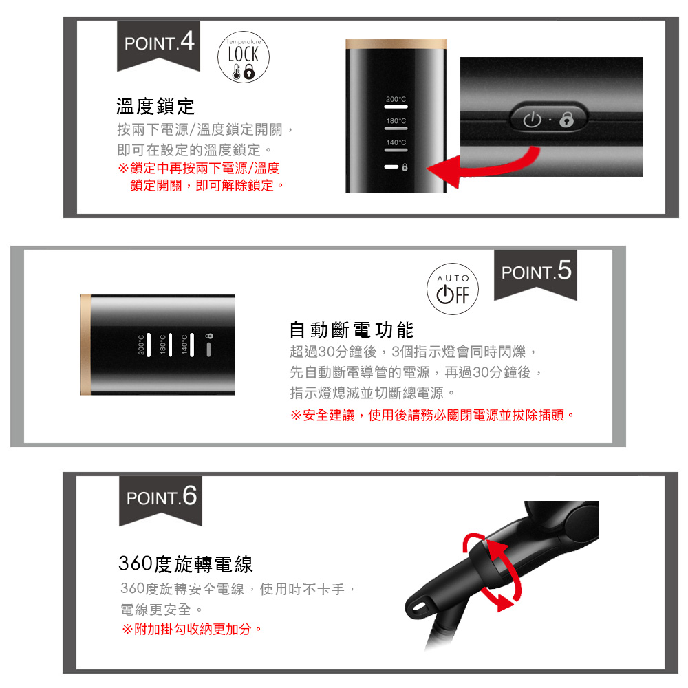 特殊彈性夾板設計,可減少對頭髮的拉扯感,負離子升級搭載,撫平毛躁、鎖住水分使秀髮散發水亮光澤柔順不打結,輕巧機身,方便在家、辦公室、旅行使用,三段溫度控制,可依據髮質健康狀況,調整適當的溫度,全新溫度鎖定功能,精準控制所需溫度,防止使用過程中誤觸,自動斷電功能,靜置約30分後自動斷電,360度旋轉電線,使用時不卡手,安全鎖鍵,方便使用完後快速收納及誤觸發熱時的夾板。