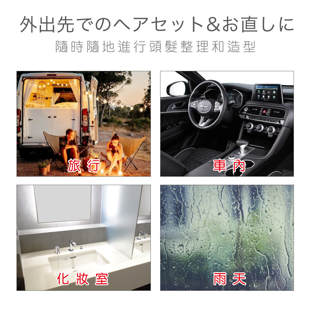 非常適合用於局部調整瀏海、髮尾造型,無論出遊旅行、商務會議、重要場合、雨天都能隨時隨地整理髮型,就像補妝一樣容易。