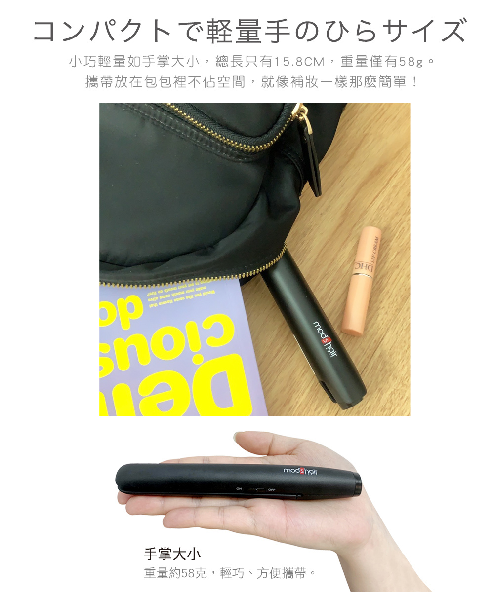 mod's hair USB插電式迷你直髮夾,方便收納在化妝袋、包包中隨身攜帶。