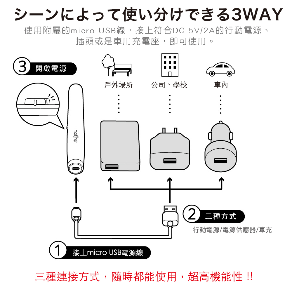 ●可接行動電源、車用座充、2A插頭