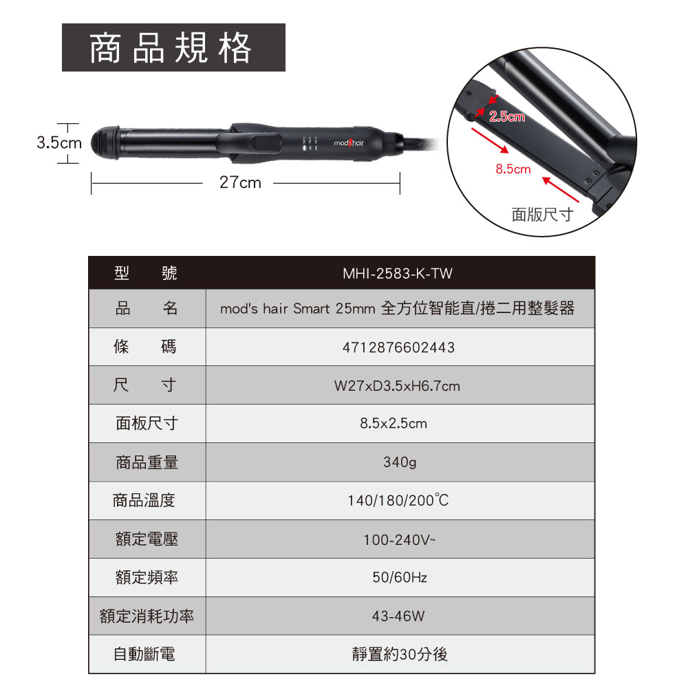 商品名稱:mod's hair Smart 25mm 全方位智能直/捲二用整髮器
