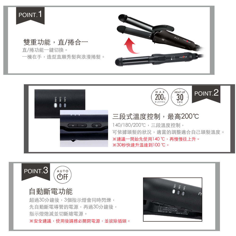 ●雙重功能,直/捲功能一鍵切換,可造型直髮與捲髮