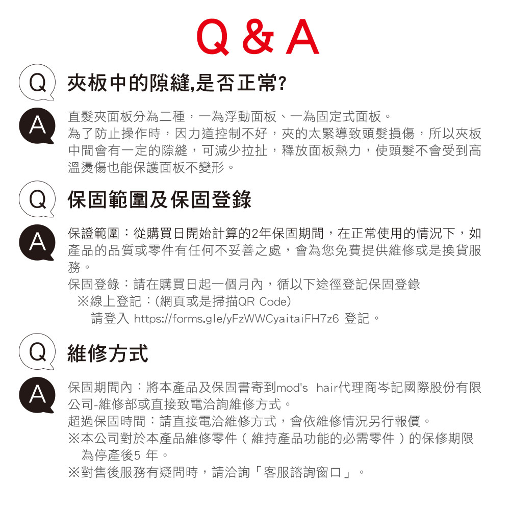 4.產品若已過保固時效,請致電洽詢mod's hair代理商岑記國際股份有限公司或是上Facebook粉絲