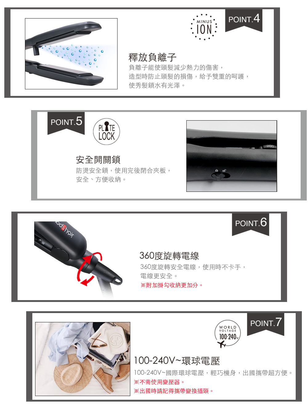 - 負離子搭載,保持髮絲柔順不毛躁