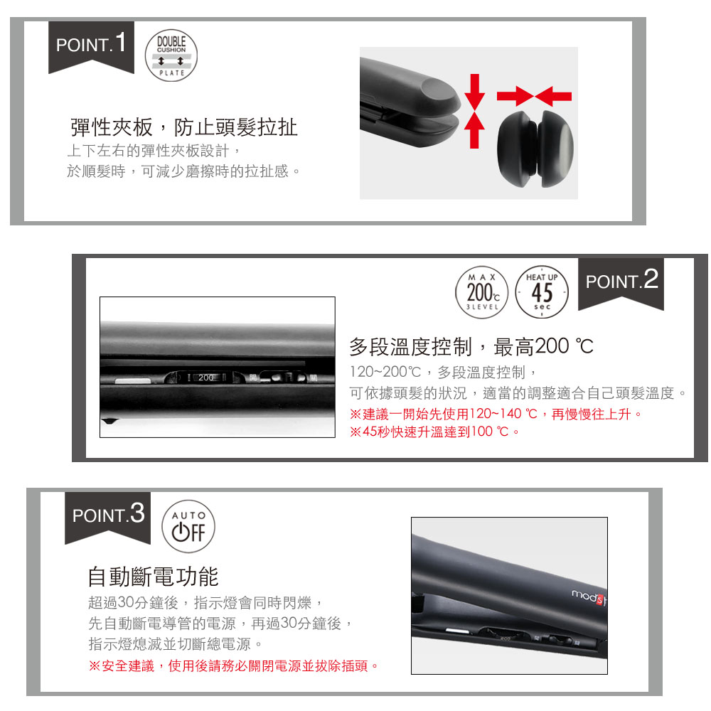 ●浮動面板設計,調節拉扯動作,減少對秀髮損傷