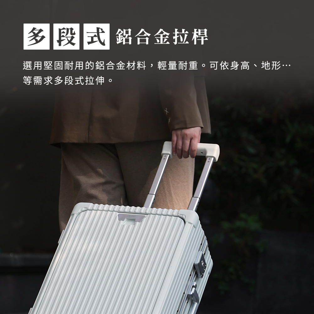 - 鋁合金邊框,相較拉鍊行李箱更加防水、耐摔耐撞、安全不易被撬開