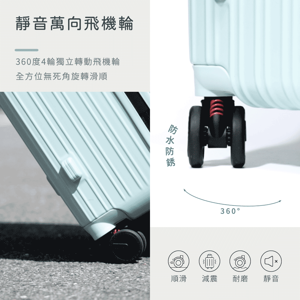 - 360度雙軸心靜音減震剎車飛機輪,能減少拖行時的晃動感,更能隨時單腳踩煞