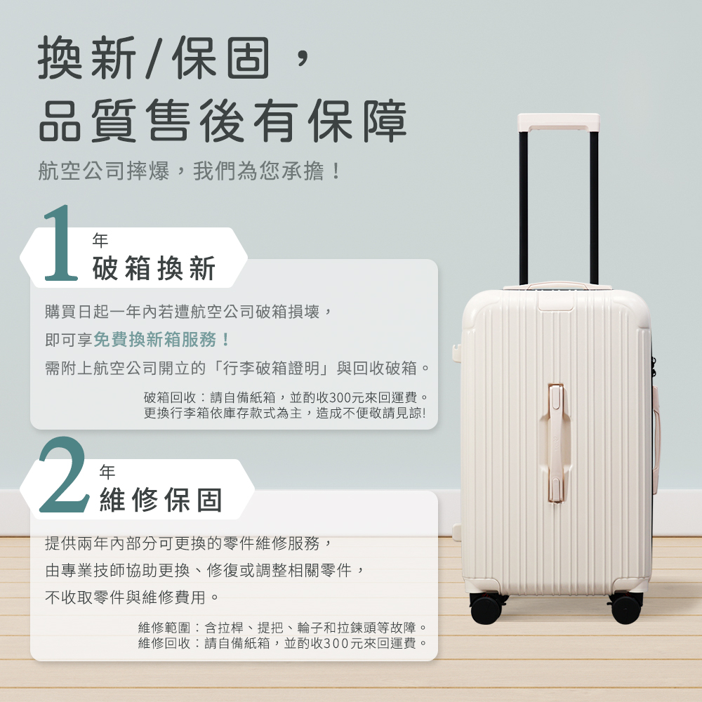 購買起二年內,可維修之零組件,包含輪子、拉桿、密碼鎖、提把等消耗品,完全不收取維修費及零件費