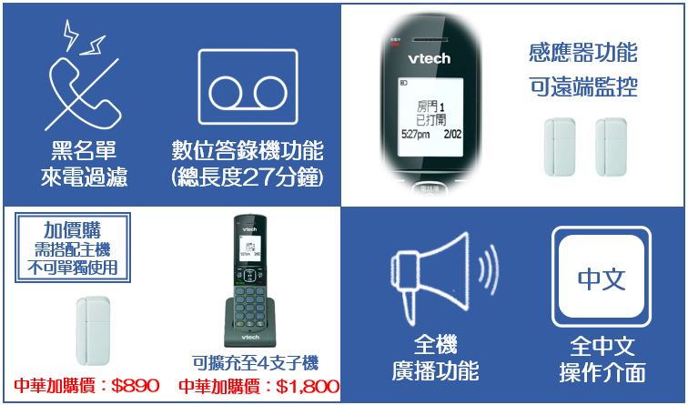 主機、子機、主機充電座、子機充電座、子機電池包、變壓器2顆、磁簧2個、4號電池4顆(磁簧1個2顆)、電話線、說明書、保固卡