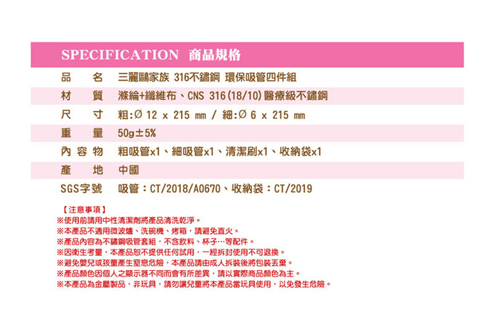 - SGS認證字號:吸管:CT/2018/A0670 : 收納袋:CT/2019