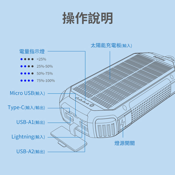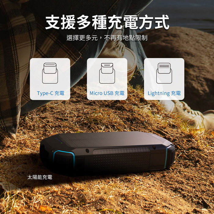- 支援多種蓄電方式:USB充電、Micro充電、Lightning充電、太陽能充電
