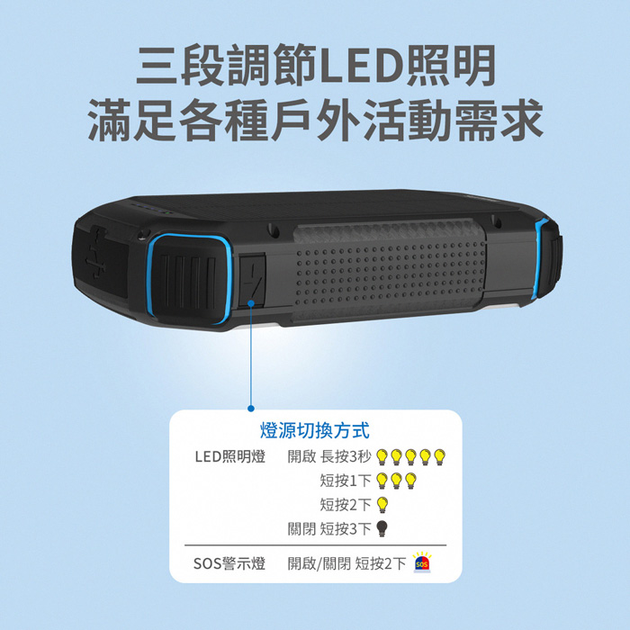 - 5種照明變換模式:LED照明三段亮度、紅藍霓紅燈、SOS求救燈(紅藍霓紅燈閃爍模式,可以清楚傳遞求救訊號)