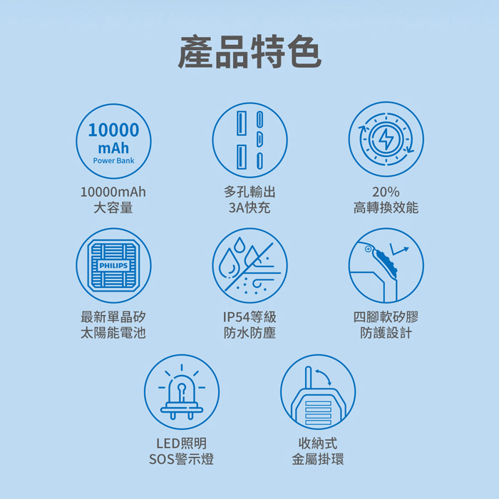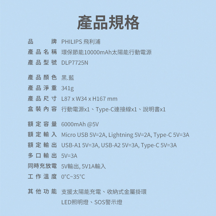 飛利浦 10000mAh太陽能行動電源 DLP7725N