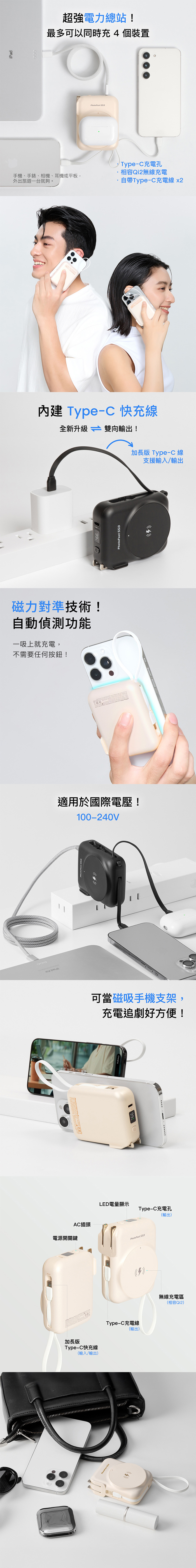 - 同時充4台裝置 內建Type-C快充線,雙向輸出