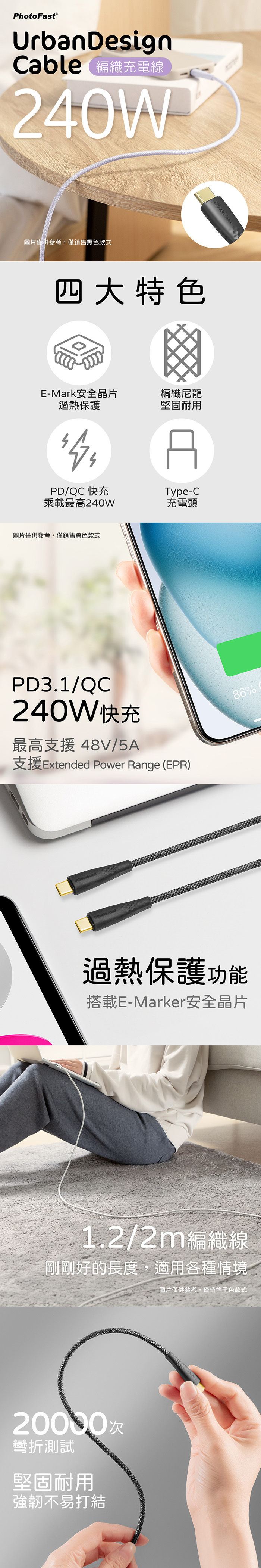 【PhotoFast】Cable 240W編織快充線 Type-C to Type-C 200cm