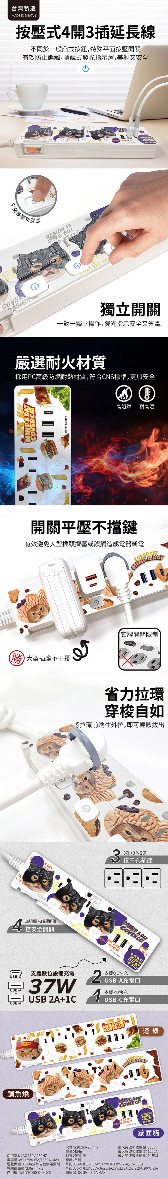 正版授權】Mind.A.Day貓咪 PD 37W平貼式4開3 1.8M/6尺 1650W 延長線-蒙面貓