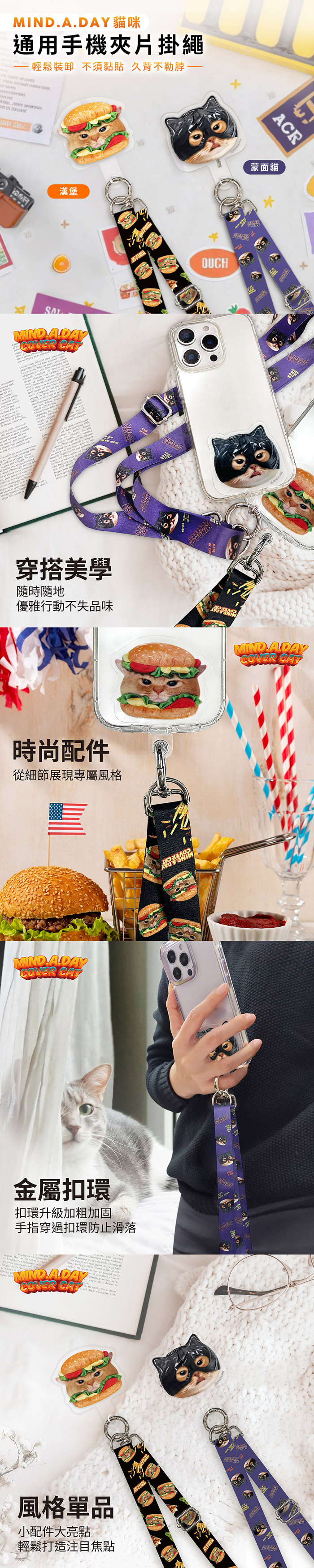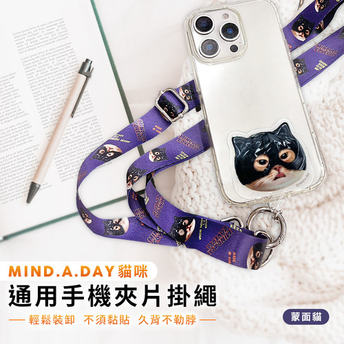 【正版授權】Mind.A.Day貓咪 通用手機夾片掛繩-蒙面貓