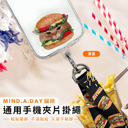 【正版授權】Mind.A.Day貓咪 通用手機夾片掛繩-漢堡